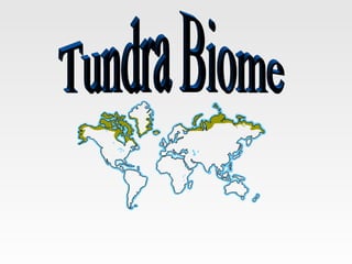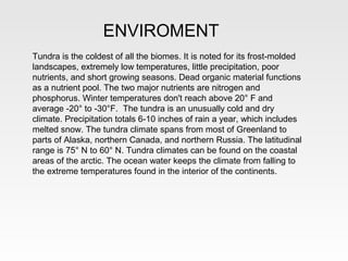 The tundra biome is the coldest of all biomes, with extremely low temperatures averaging between -20°F to -30°F. It has a short growing season and receives little precipitation annually. Plants grow slowly due to the cold and include various mosses, shrubs, grasses, and willows. Fauna includes herbivores like caribou and lemmings, and carnivores such as arctic foxes and polar bears. Threats to the tundra include melting permafrost from climate change and human disturbances from resource extraction and infrastructure development. The tundra plays an important role in global climate regulation and biodiversity.
