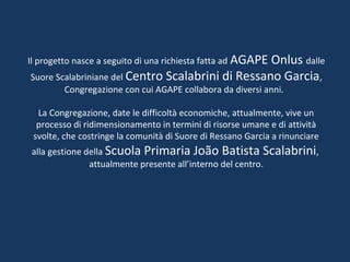 Il progetto 'Educazione è un diritto di tutti' in Mozambico nasce per affrontare le difficoltà economiche del centro scalabrini di Ressano Garcia, che non è più in grado di gestire la scuola primaria João Batista Scalabrini. In collaborazione con A.G.A.P.E. Onlus, è prevista la riqualificazione di un edificio in disuso per trasformarlo in una scuola primaria, con un finanziamento di € 9000 dalla Chiesa Valdese. Al termine dei lavori, la scuola includerà cinque aule, doppi servizi e un blocco amministrativo, e le suore continueranno a supportare le attività educative.