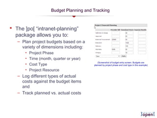 The document discusses budget planning and tracking in project-open. It allows users to: