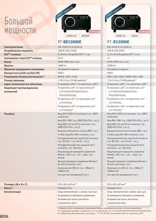 Документ описывает линейку проекторов с различными характеристиками, включая яркость до 12000 лм, различные разрешения (wuxga, sxga+) и множество входов и выходов для подключения. Пректоры имеют высокую контрастность и оптические характеристики, такие как сдвиг оси и коррекция трапецеидальных искажений. Они предназначены для использования в домашних кинотеатрах, конференц-залах и других сферах, требующих мощного проекционного оборудования.