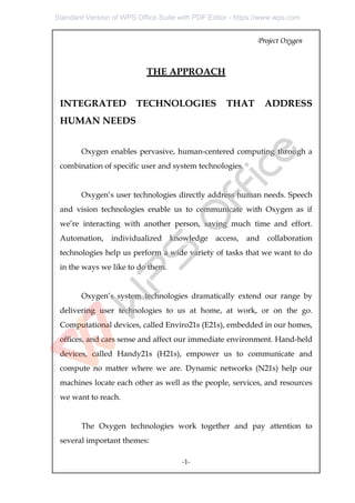 Project Oxygen integrates user and system technologies to create a human-centered computing environment that supports communication, task automation, and individualized knowledge access. Through stationary and handheld devices, users can interact with their environment and access information seamlessly, leveraging dynamic networks that facilitate collaboration and resource discovery. The system is designed to adapt to user needs while ensuring privacy and security in their interactions.