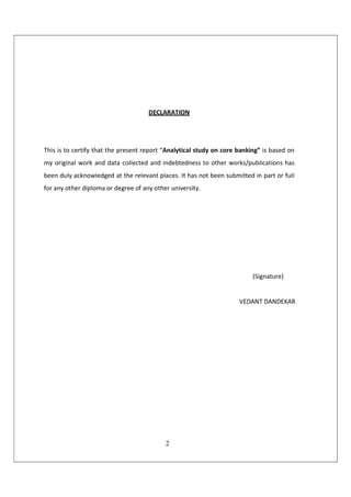 This document is a project report submitted to the University of Mumbai by Vedant Dandekhar for the partial fulfillment of a Bachelor of Commerce degree in Banking and Insurance. The report contains an introduction to core banking in India, an acknowledgements section, table of contents, and the initial chapters which provide background on the banking sector in India, the history and need for core banking systems, and the research methodology used for the project.