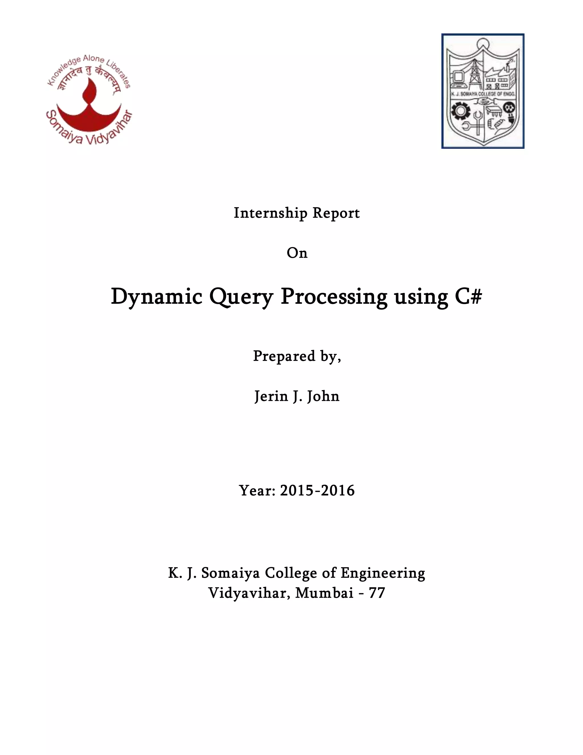 This document is an internship report submitted by Jerin J. John to K. J. Somaiya College of Engineering. The report details a project to develop a program in C# to dynamically query XML data using LINQ queries obtained from a text file or user input at runtime. The program utilizes dynamic code compilation to generate and execute a method containing the LINQ query on the XML data. Key concepts used include LINQ, lambda expressions, delegates, and generating C# code at runtime to dynamically process queries.