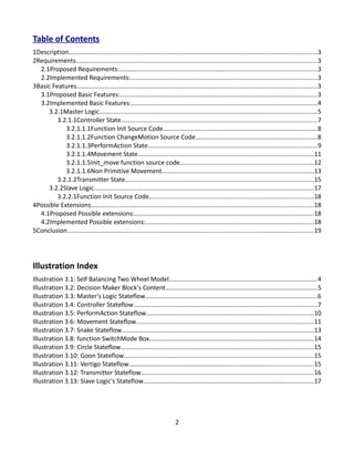 The document describes a project to implement coordinated movement between two robots (Lego bricks). The master brick generates and performs random sequences of movement patterns (sets of motions). It sends the command number to the slave brick using Bluetooth communication. The master waits for an acknowledgement from the slave before moving to the next command. Fourteen predefined primitive and complex movements are implemented. The master's logic is divided into controller and transmitter states to manage movement and communication. The slave brick has its own logic stateflow to receive and execute the transmitted commands from the master.
