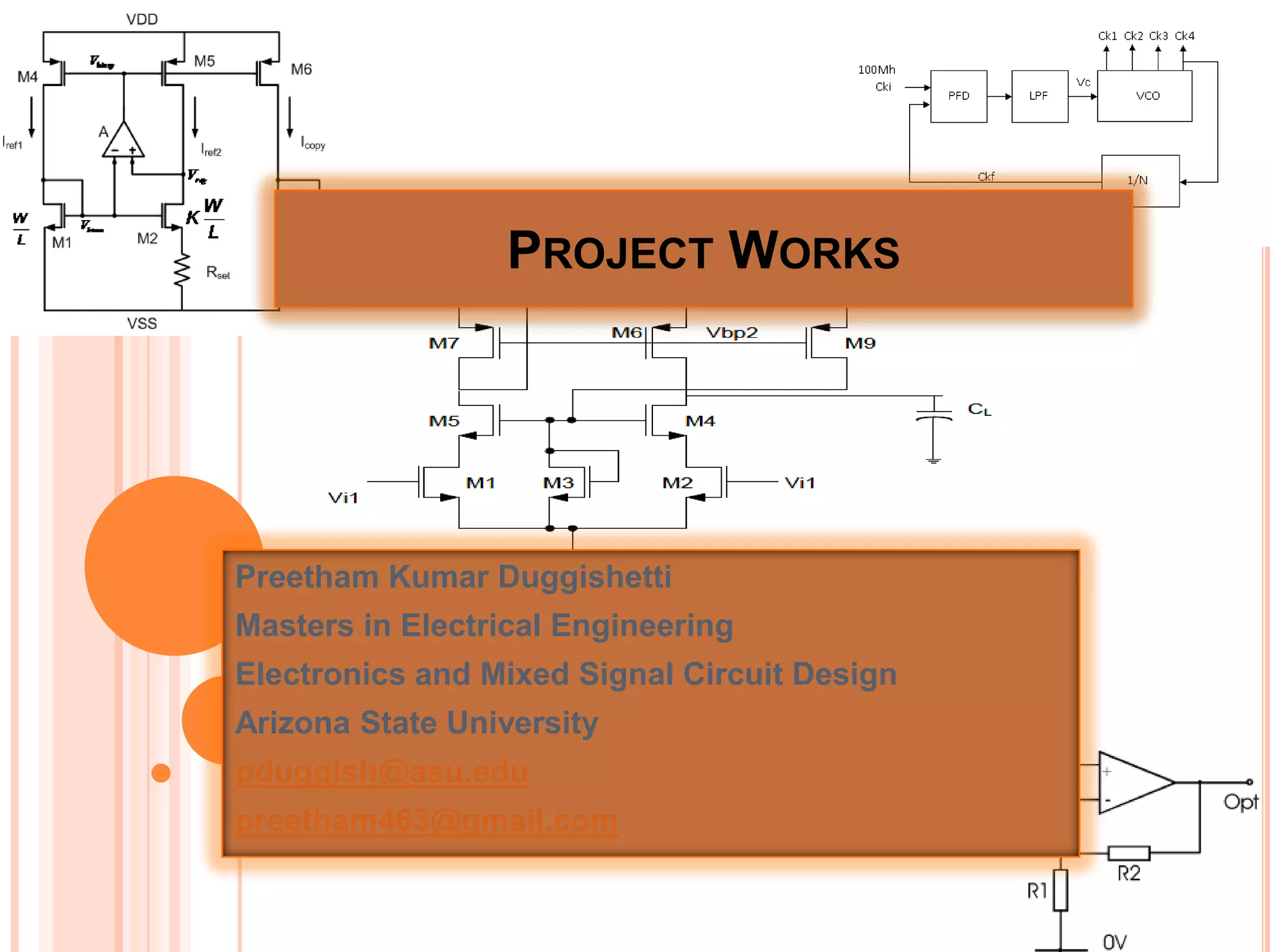 The document outlines Preetham Kumar Duggishetti's Masters projects in electrical engineering focusing on circuit design, including projects developing a Phase Locked Loop at 1.6GHz, a low power 32-bit ALU, an oversampling Sigma Delta ADC for WLAN systems, and more. The projects involved designing circuits in Cadence and developing behavioral models in VerilogA and MATLAB to meet various power, speed, and dynamic range requirements. Preetham's work demonstrates expertise in analog and mixed-signal circuit design.