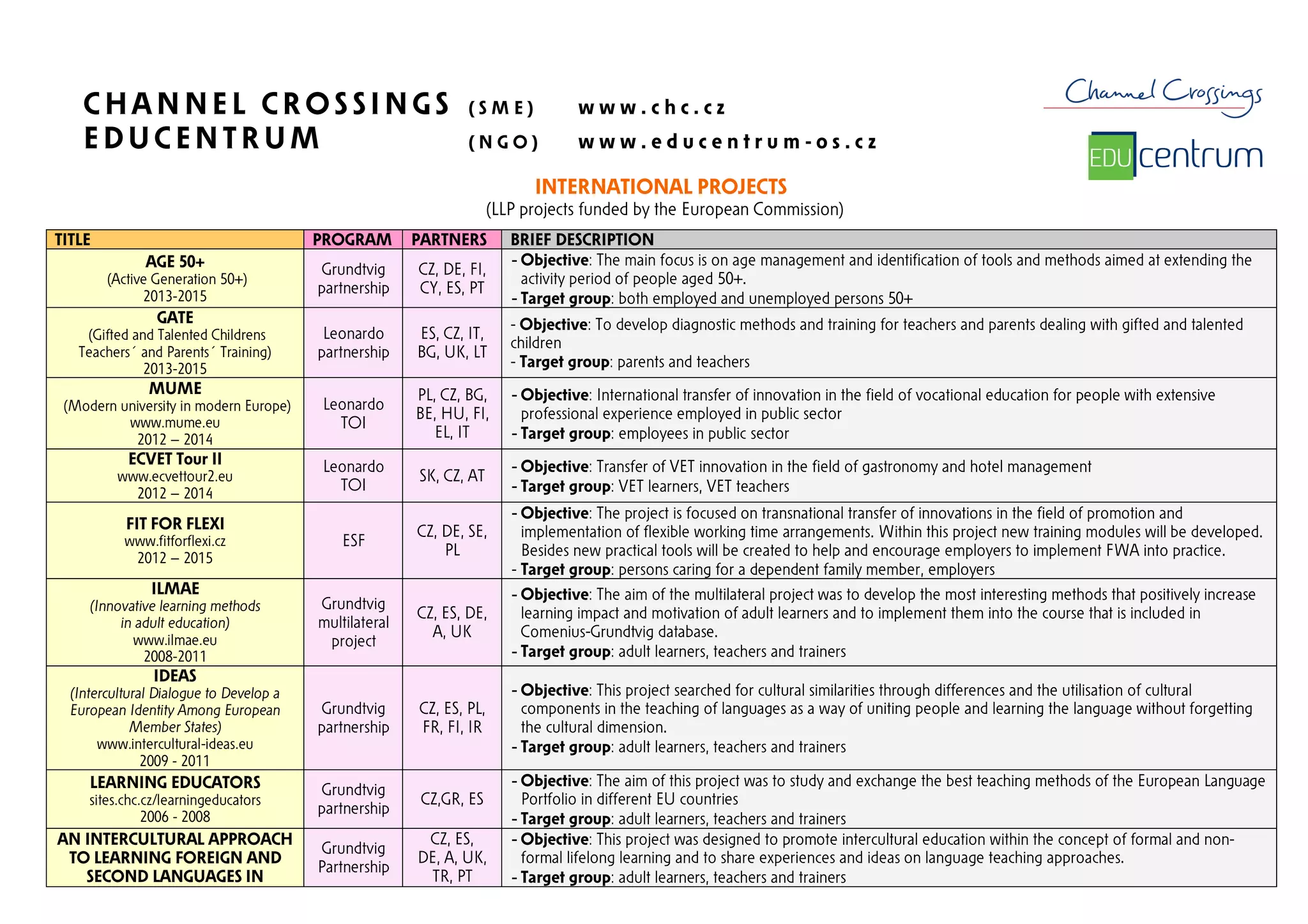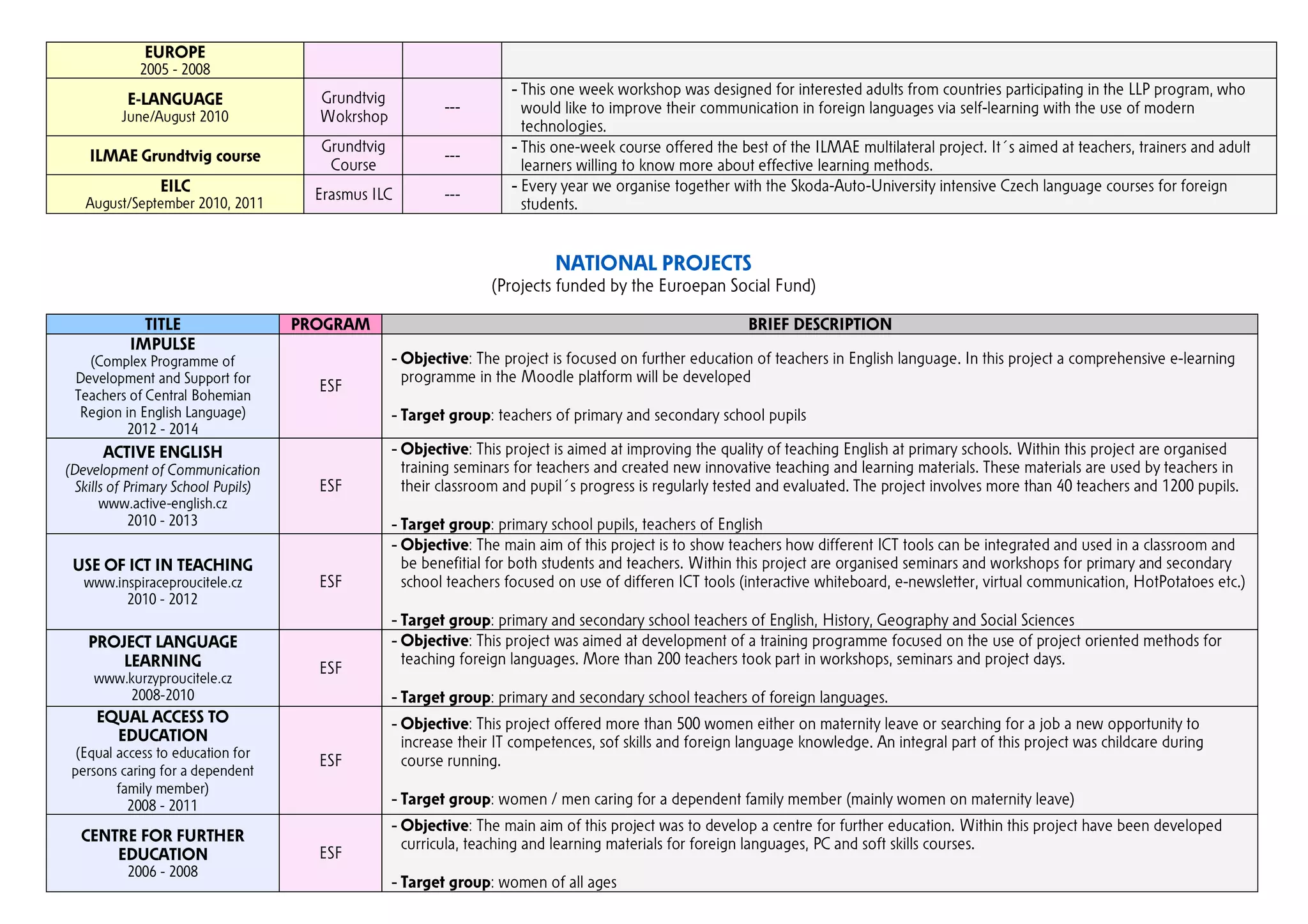 The document outlines various international and national projects focused on education and training, particularly for teachers and learners in the context of gifted education, vocational training, and language learning. Key objectives include the development of innovative teaching methods and tools, improving the quality of education, and promoting inclusivity for adults, especially those aged 50+ and caregivers. The projects involve multiple European countries and target diverse groups, including teachers, parents, and adult learners.