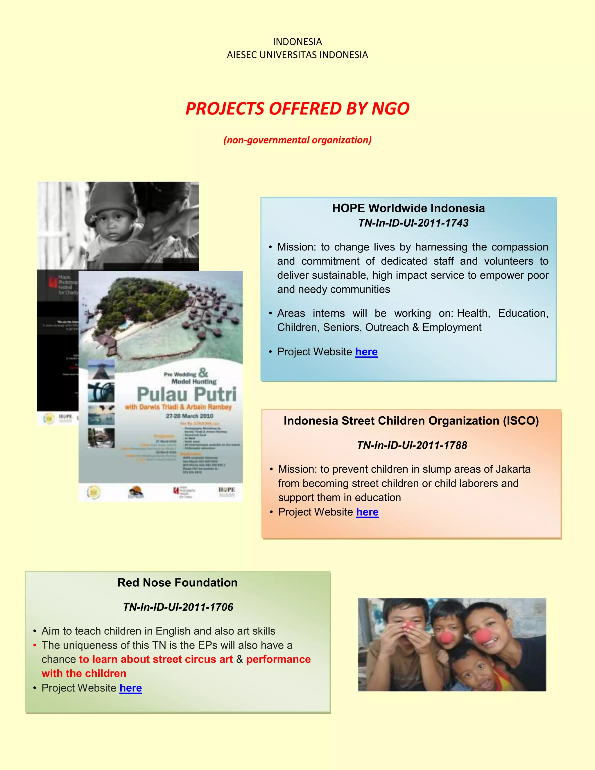 This document provides information on projects offered by four different non-governmental organizations (NGOs) in Indonesia: HOPE Worldwide Indonesia, which empowers poor communities through health, education, children and senior services; Indonesia Street Children Organization (ISCO), which supports children's education to prevent them from becoming street children; Red Nose Foundation, which teaches children English and art skills while giving interns experience with street circus arts; and Yayasan Kampus Diakoneia Modern (KDM), which enables street children to become self-supporting adults through skills training in a caring environment.