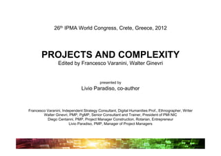 The document discusses the 26th IPMA World Congress held in Crete, Greece, focusing on the intersection of projects and complexity, highlighting a multidisciplinary approach by a group of experts. Key findings include exploring seven principles of complexity theory in project management and advocating for a systemic mapping tool to better understand project dynamics. The future of project management is suggested to emphasize a humanistic approach, where project managers act as integrators rather than mere specialists.
