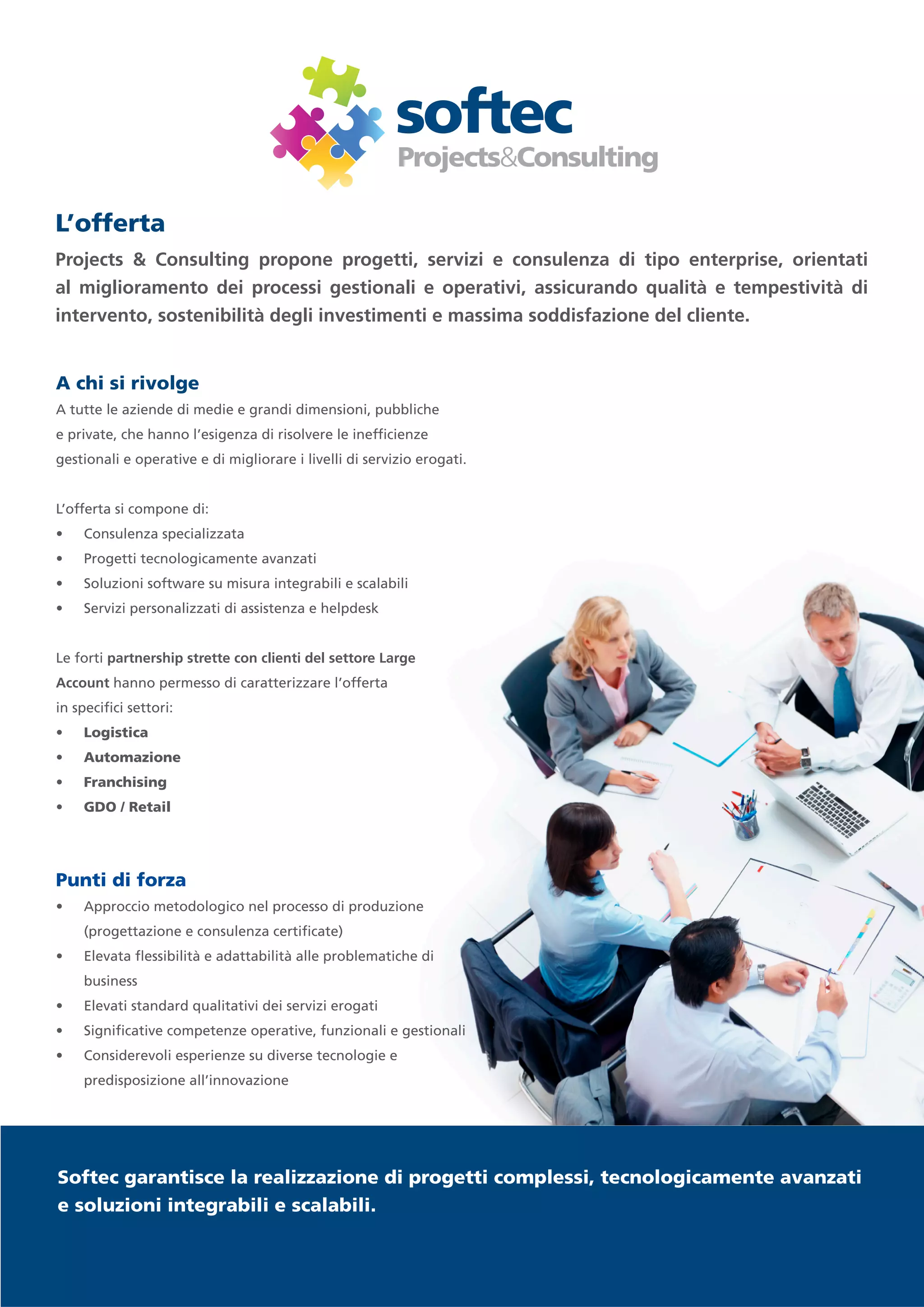 L'offerta di projects & consulting di Softec propone consulenze e soluzioni tecnologiche personalizzate per aziende medie e grandi, mirate a migliorare l'efficienza operativa e gestionale. Le aree di specializzazione includono logistica, automazione, franchising e retail, con un approccio flessibile e qualificato. Softec si avvale di un team di esperti per realizzare progetti complessi e certificati, garantendo alti standard qualitativi e innovazione.