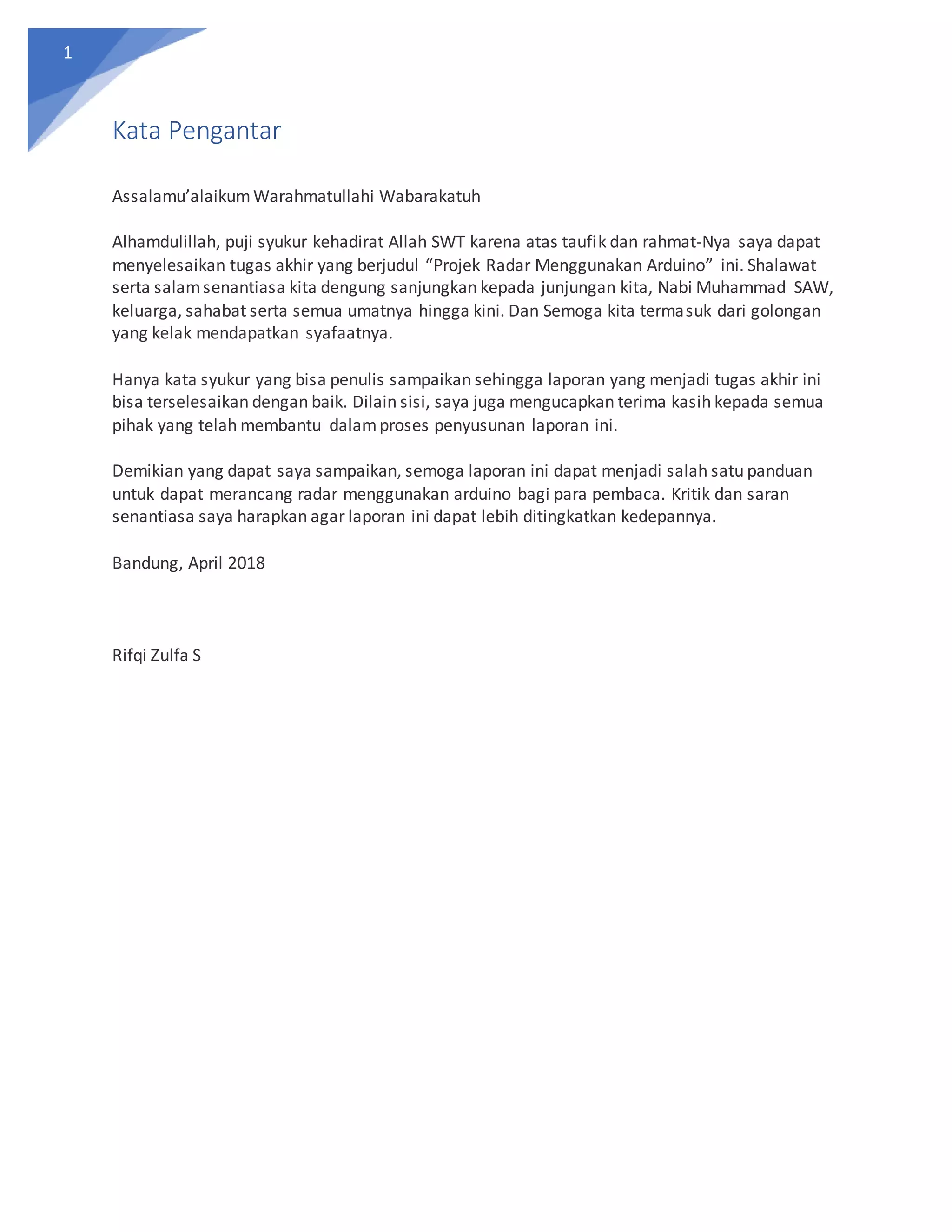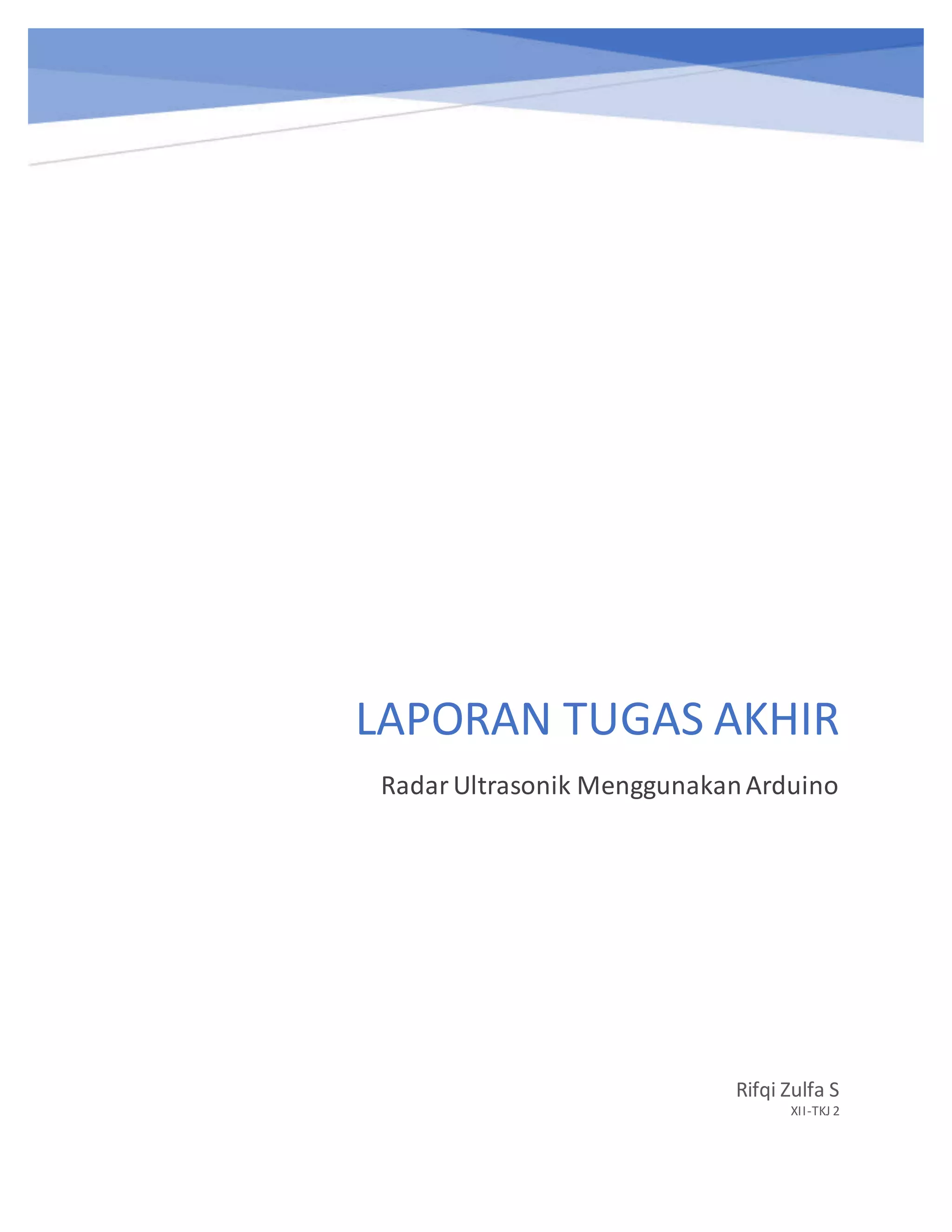 Dokumen ini adalah laporan tugas akhir yang membahas proyek radar ultrasonik menggunakan Arduino oleh Rifqi Zulfa. Proyek bertujuan untuk mendeteksi penghalang menggunakan sensor ultrasonik dan memberikan panduan dalam perancangan serta implementasi radar. Meskipun sederhana, proyek ini memiliki potensi untuk dikembangkan lebih lanjut dalam berbagai bidang seperti militer dan penerbangan.