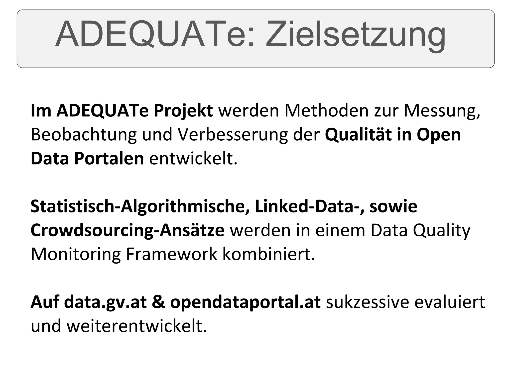The ADEQUATe project develops methods to measure, monitor, and improve data quality in open data portals. Statistical, algorithmic, linked data, and crowdsourcing approaches are combined in a data quality monitoring framework. These methods are evaluated and further developed on the data.gv.at and opendataportal.at portals. The goals are to define quality measures, monitor quality evolution over time, and improve quality through algorithms, linking data to other open datasets, and crowdsourcing.