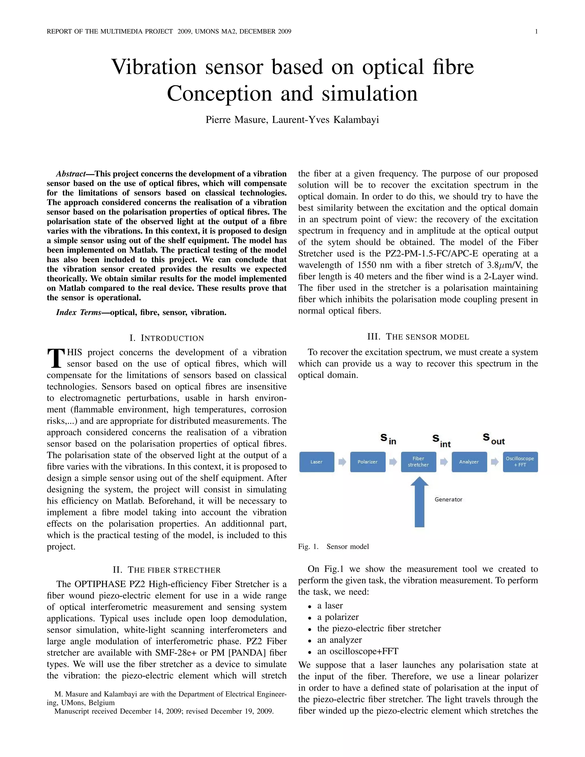This document summarizes the design and simulation of a vibration sensor based on optical fibers.