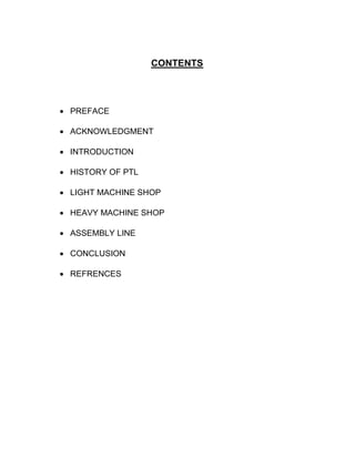 This document provides details about an industrial training report submitted by Rishabh Kaushik to his professor, Mr. Ashutosh Singh. The report describes Rishabh's 4-week training at Mahindra and Mahindra's Swaraj Division in Mohali. It includes sections on the history of Punjab Tractor Limited (PTL), which established the Swaraj brand, as well as details about the light machine shop, heavy machine shop, assembly line, and units of the Swaraj Group including the tractor, engine, foundry, and combine divisions.