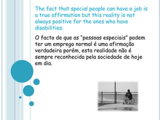 This document discusses jobs for disabled people. It notes that while disabled people can have jobs, this is not always recognized by society. Several factors influence a disabled person's access to employment, including job incentives, sensitization efforts, education, technical aids, and eliminating discrimination. Hiring disabled people benefits companies through tax breaks and improving their public image. However, disabled job seekers still face significant challenges like prejudice from employers who see them as less capable. The document advocates for sensitization programs to help the public understand that disabilities do not define work ability.