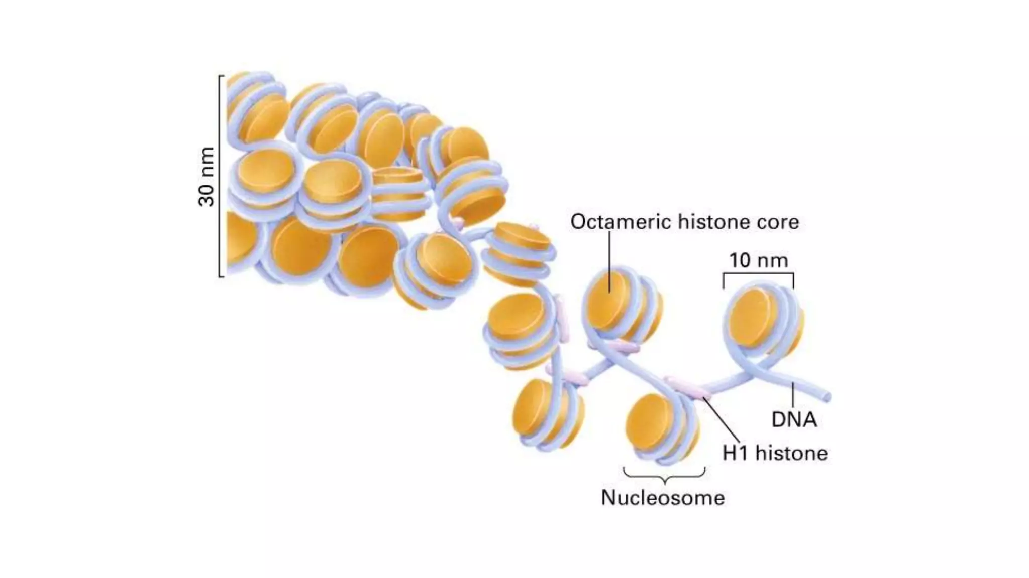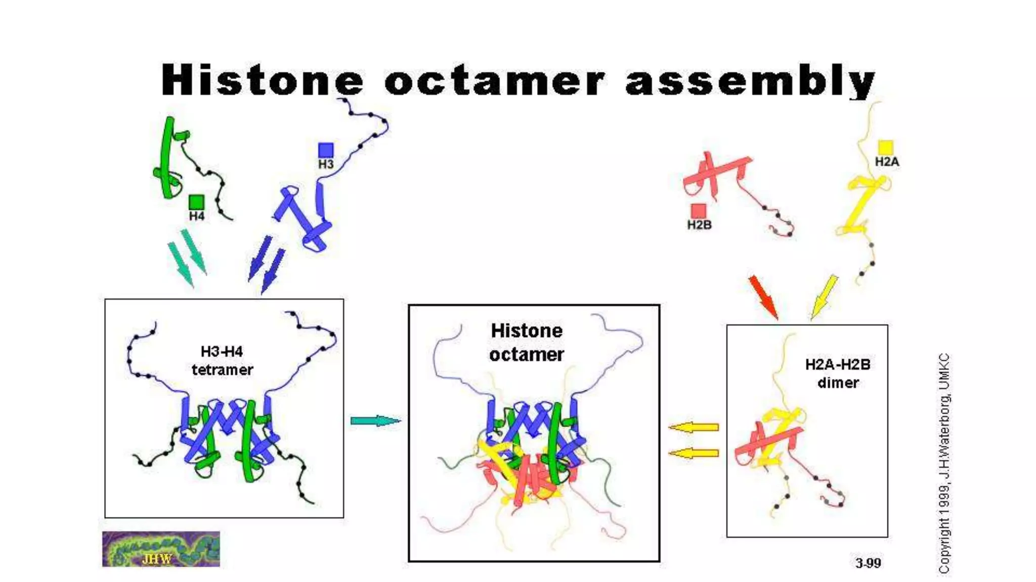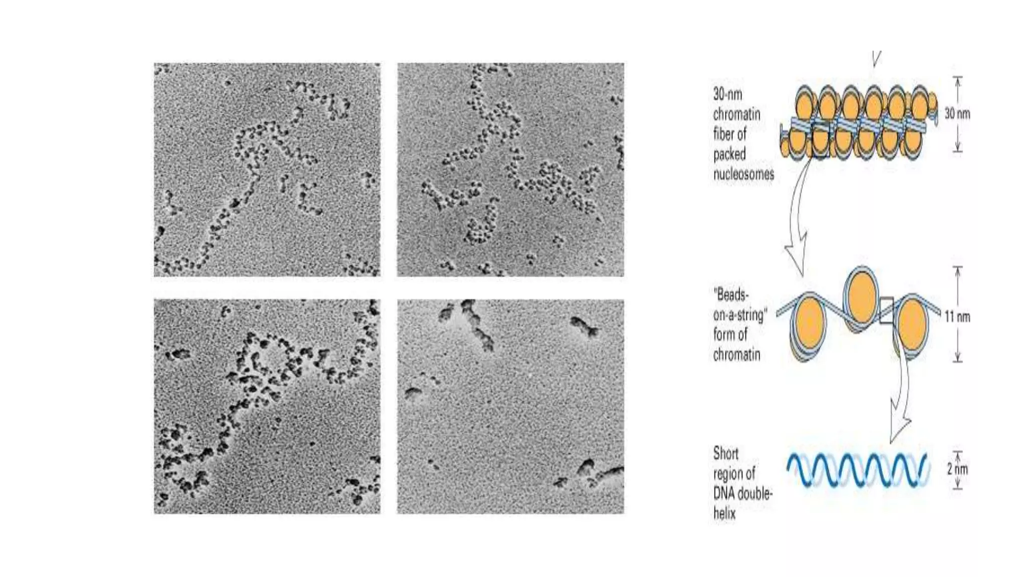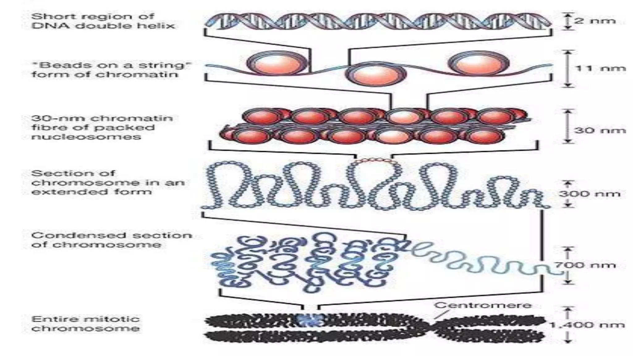 The document discusses the structure and organization of DNA and chromosomes in prokaryotes and eukaryotes. It explains that in prokaryotes, DNA is located in the cytoplasm and not enclosed in a nucleus, while in eukaryotes DNA is packaged into chromosomes within the nucleus. The basic unit of chromatin in eukaryotes is the nucleosome, which involves DNA wound around an octamer of core histone proteins (H2A, H2B, H3, H4). This facilitates a high level of DNA compaction through hierarchical levels of organization involving histone modifications and DNA-binding proteins.