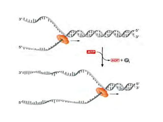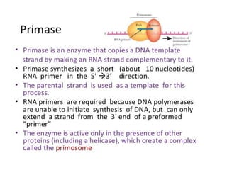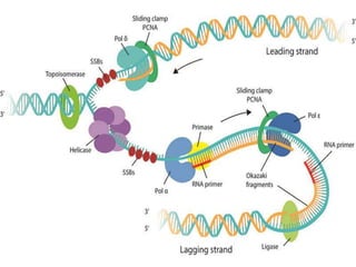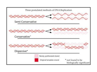 The document discusses prokaryotic DNA replication, highlighting different models such as conservative, semiconservative, and dispersive replication, with a focus on the semiconservative model proven by Meselson and Stahl's experiment. It outlines key components, including the enzymes involved (helicases, topoisomerases, DNA polymerases, and ligases), and describes the process of replication initiation, strand synthesis, and the roles of RNA primers and Okazaki fragments in lagging strand synthesis. Additionally, it emphasizes the significance of the origin of replication and provides a detailed look at the mechanics of DNA polymerization and the leading and lagging strand dynamics.