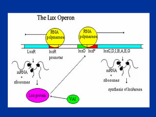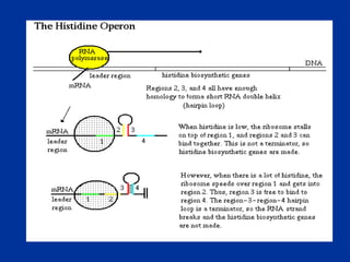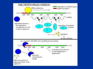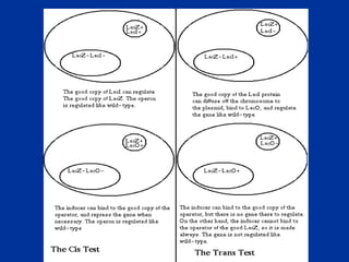 This document discusses various techniques used to study prokaryotic genetics, including bacterial conjugation, phage transduction, transformation, cross-feeding, and complementation. It provides examples of how these techniques can be used to determine the order and function of genes in metabolic pathways. Specifically, it describes experiments using the lactose operon in E. coli to elucidate the mechanism of transcriptional gene regulation in response to environmental conditions.