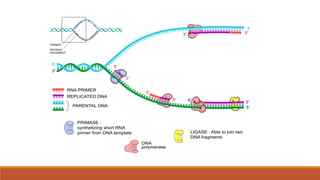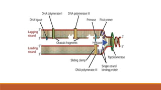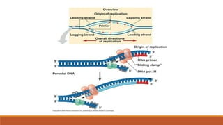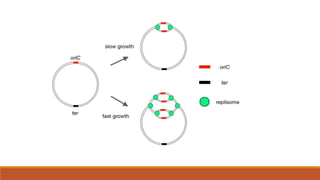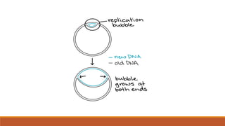 DNA replication in prokaryotes involves initiation, elongation, and termination phases. Initiation begins with the binding of initiator proteins to the origin of replication, unwinding the DNA helix to form replication forks. Elongation synthesizes the leading and lagging strands bidirectionally away from the origin using DNA polymerases. Termination occurs when the replication forks meet, completing duplication of the chromosome.