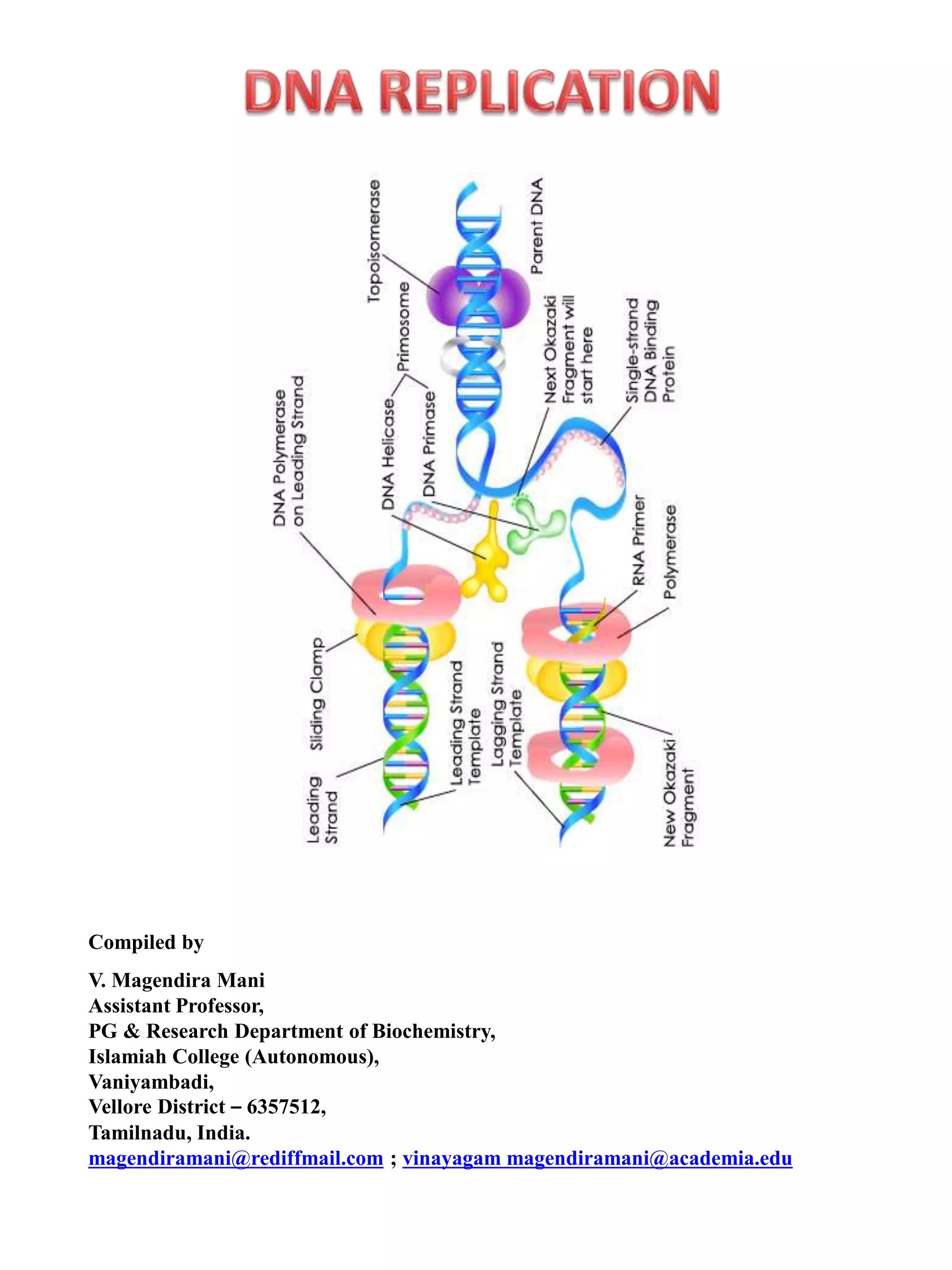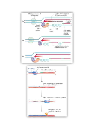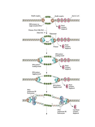Replication in prokaryotes occurs through three main stages - initiation, elongation, and termination. Initiation begins at a specific origin of replication site called OriC, where DnaA protein binds and unwinds the DNA, forming an open complex. Elongation then proceeds bidirectionally as DNA polymerase synthesizes leading and lagging strands. Termination occurs when the replication forks from opposite directions meet. The entire replication process in E. coli takes around 40 minutes to complete replication of its genome.