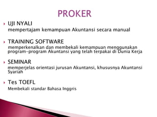 Dokumen tersebut merangkum program-program pelatihan yang ditawarkan divisi pelatihan untuk mahasiswa akuntansi, meliputi pelatihan keterampilan manual akuntansi, pengenalan software akuntansi yang digunakan di dunia kerja, seminar untuk menjelaskan orientasi jurusan akuntansi khususnya akuntansi syariah, dan tes bahasa Inggris. Program-program pelatihan tersebut bertujuan mempersiapkan mahasiswa dengan berbagai keterampilan yang dibut