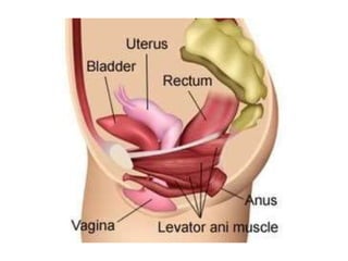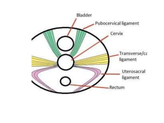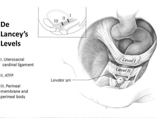 - Examination findings like prolapse classification systems, differential diagnosis, and management options like conservative treatments, reconstructive surgery, obliterative procedures, and hysterectomy.