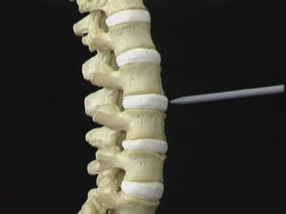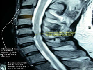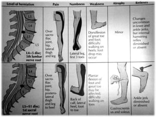 An intervertebral disc prolapse occurs when a tear in the annulus fibrosus allows the nucleus pulposus to bulge out. This most commonly affects the lumbar region, specifically the L4-L5 and L5-S1 discs. Symptoms include back pain radiating into the buttocks and legs. A physical exam reveals limited back movement, muscle spasms, and tenderness over the affected disc. Straight leg raises can reproduce the pain. Diagnosis is confirmed with imaging studies.