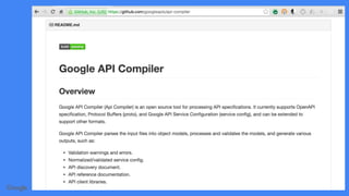 3. Google developed the API Compiler and google.api.service description format to enable tools to support API creators using OpenAPI on many platforms and Google services like billing and quotas.
