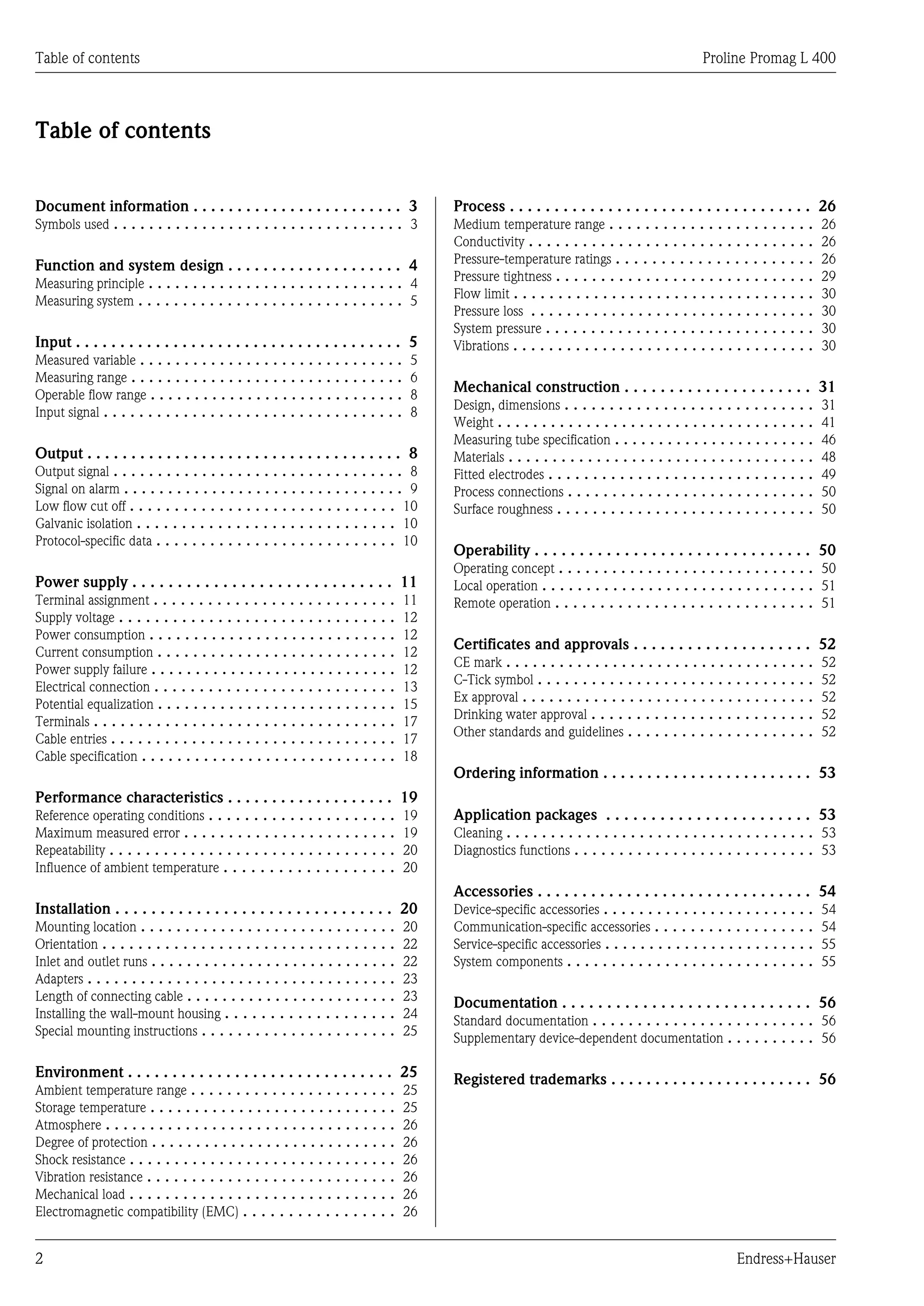 The document details the Proline Promag L 400 electromagnetic flow measuring system, designed for economical bidirectional measurement of liquids with a minimum conductivity of 3.5 mS/cm, suitable for water and wastewater applications. It features robust specifications including a range of nominal diameters, various liner materials with drinking water approvals, and capabilities like simultaneous flow and conductivity measurement, with simple installation and commissioning processes. The device is characterized by its pressure and temperature immune measuring principle, making it reliable and efficient in various operational environments.