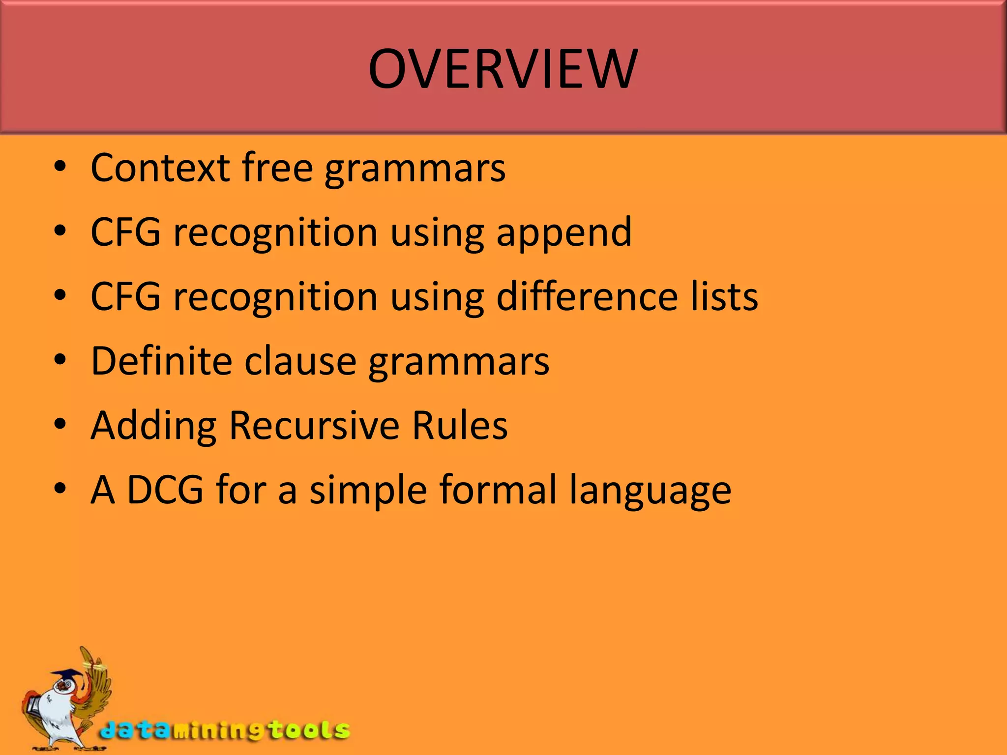This document discusses using definite clause grammars (DCGs) to define context free grammars in Prolog. It begins with an example grammar for a simple language and shows how to represent it as Prolog rules using append and difference lists. It then introduces DCGs as a notation that hides the underlying difference list implementation. The document demonstrates adding recursive rules to generate infinite sentences and defines a DCG for the formal language a^nb^n.