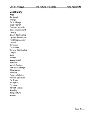 The document provides an introduction and overview for a science class. It includes definitions and examples of key science concepts like observation, inference, prediction, classification, measurement, mass, temperature, states of matter, and scientific notation. The summary also notes vocabulary terms that will be covered. Overall, the document outlines foundational science concepts and vocabulary to prepare students for the upcoming class.