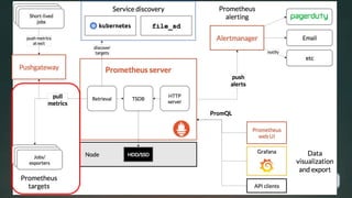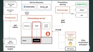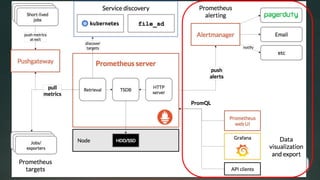 This document provides an overview of the Prometheus monitoring system. It discusses that Prometheus was originally created by frustrated engineers at SoundCloud to address their monitoring needs. It gained popularity and was later maintained as an open source project. Major milestones included Prometheus 1.0 and 2.0 releases, joining the CNCF, and graduating as a CNCF project. The document outlines ongoing work to improve areas like data integrity, security, and community involvement through initiatives like OpenMetrics. The future of Prometheus is focused on further developing the project and monitoring ecosystem through an expanding team and community.