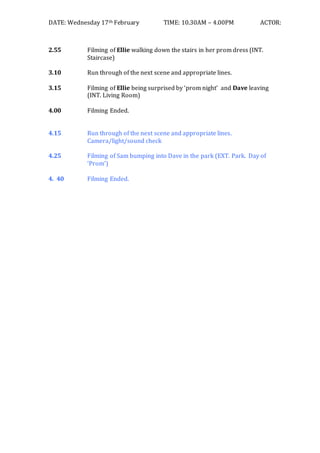 The document outlines a film shoot plan for February 17th from 10:30AM to 4:00PM. It details the scenes and shots to be filmed for the movie "Promise" including an opening kitchen sequence, Dave leaving for the shops, the introduction of Sam, Ellie texting Sam, Sam meeting Dave, Ellie arguing with Dave and getting ready in her bedroom for prom. It provides the approximate timing and locations for each shot.