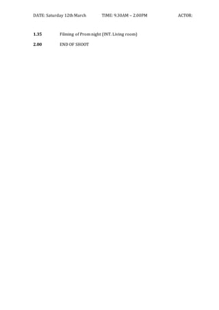 The document outlines the shoot plan for a film called "PROMISE" taking place on Saturday March 12th from 9:30AM to 2PM. It details the various scenes that will be filmed, including scenes in the kitchen, bedrooms, front door, living room, and outside. It provides the approximate timing for setting up shots, rehearsing lines, and filming each sequence. The shoot will include scenes of characters leaving the house, arriving home, texting, arguing, and getting ready for a prom night.