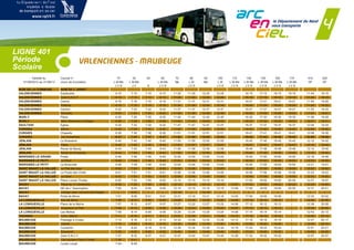 This document contains a schedule for bus routes 401 and 402 in the Maubeuge-Valenciennes area of France. It lists all the stops along each route as well as departure times from major stops throughout the day. The schedule is valid from September 1, 2012 to August 31, 2013 and specifies which days of the week each bus number runs.