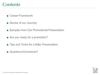The document provides guidance on preparing for a promotion presentation at a sustainability consultancy. It discusses reviewing one's career path and alignment with company behaviors. It shares advice from employees who underwent the promotion process, including preparing by practicing presentations with one's supervisor. The document also includes examples of slides presented by employees highlighting goals, achievements and qualifications for being promoted. Tips are provided such as not reading one's presentation but making it engaging and using visual aids to tell one's story.