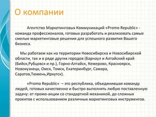Агентство маркетинговых коммуникаций 'Promo Republic' предлагает широкий спектр маркетинговых услуг, включая промо-акции, мерчандайзинг, event marketing и рекламные кампании по всей Сибири. Команда профессионалов готова реализовать как простые, так и сложные проекты, обеспечивая качественное выполнение задач и поддержку клиентов. Агентство также активно участвует в организации мероприятий и обучении персонала, что подтверждается проведением значимых акций и форумов.