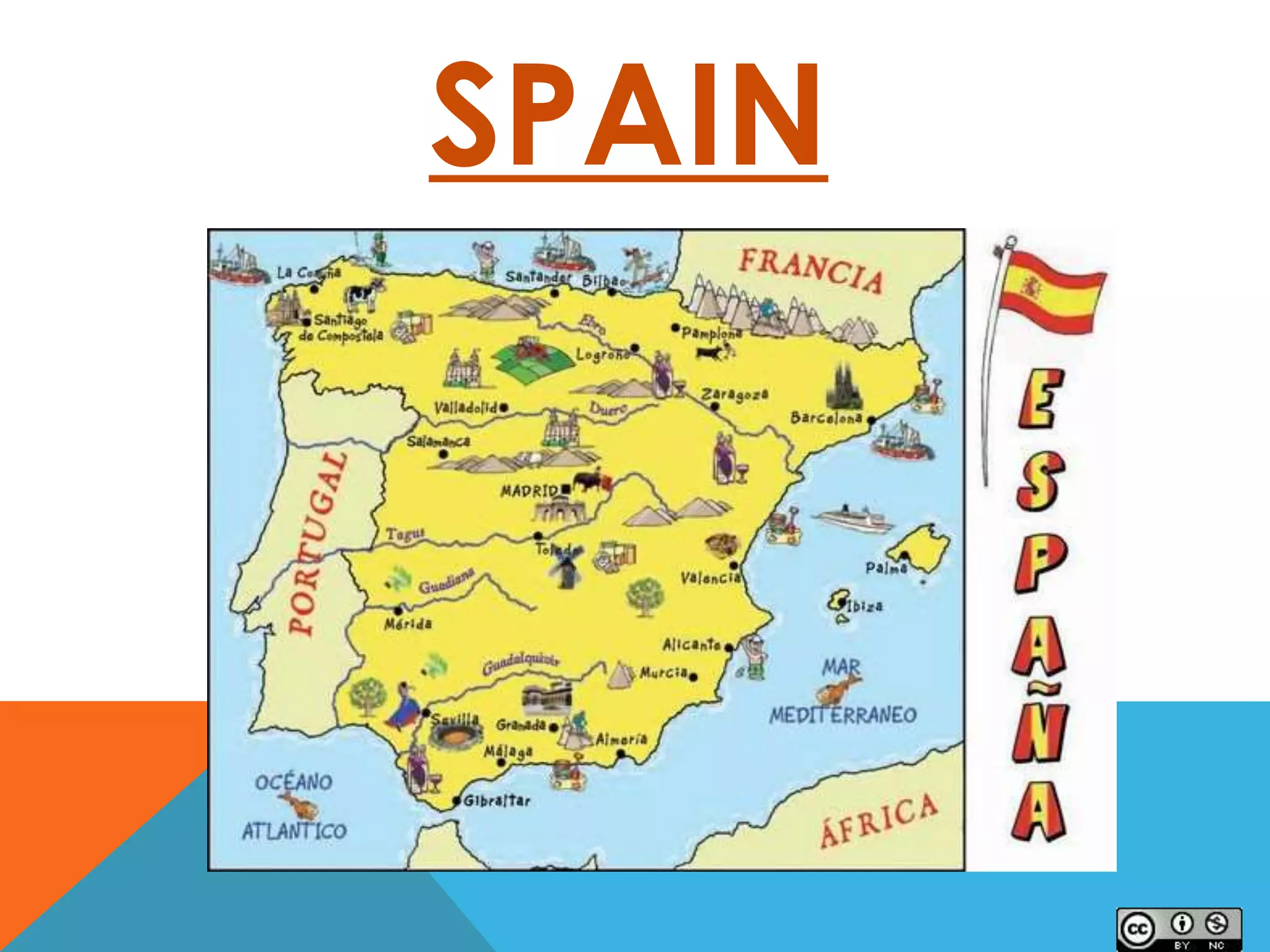 Spain is a country located in southern Europe between the Mediterranean Sea and the Atlantic Ocean. It has been inhabited by many groups throughout history including Iberians, Celts, Phoenicians, Greeks, Carthaginians, Romans, and Visigoths. Major festivals in Spain include Easter, Sanfermines in Pamplona, and the April Fair in Seville. Typical Spanish food includes omelettes and sangria. Galicia is an autonomous community in northwest Spain with Galician and Spanish as its official languages. Galicia shares similarities with Portugal due to their shared linguistic history. The Camino de Santiago pilgrimage route ends at the Cathedral of Santiago de Compostela in Galicia. Cambre is