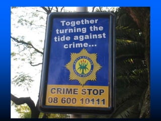 The document discusses strategies for promoting crime prevention initiatives, emphasizing the importance of adapting to modern media such as social media while also leveraging traditional media methods. It suggests utilizing emotional appeals, engaging community role models, and rewarding law enforcement successes to enhance outreach efforts. The conclusion stresses the necessity of promotion for effective communication and success in crime prevention initiatives.