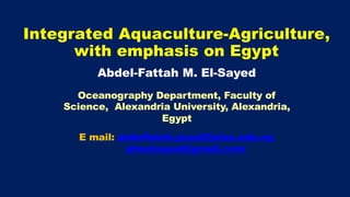 The document discusses the integration of aquaculture with agriculture in Egypt to address severe water scarcity issues exacerbated by population growth. It outlines various aquaculture practices such as rice-fish and wheat-fish systems, emphasizing environmentally sustainable methods that can enhance food production and increase rural livelihoods. Additionally, it highlights the importance of responsible water resource management and the potential benefits of innovative systems like aquaponics and in-pond raceway systems.