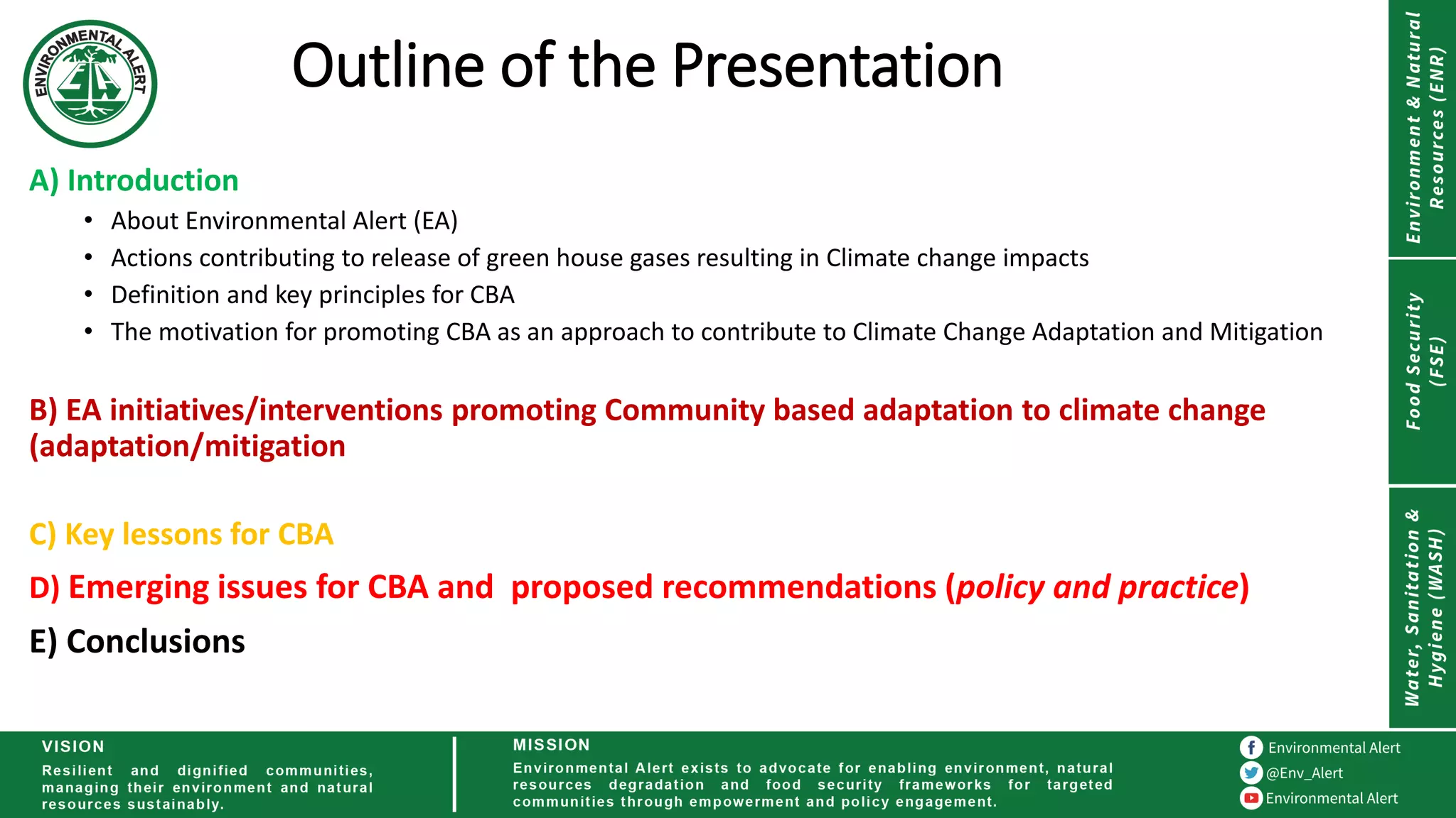 The document presents experiences and recommendations on promoting community-based adaptation (CBA) in Uganda, emphasizing the role of the Environmental Alert organization in addressing climate change impacts through community-led initiatives. It outlines strategies, key lessons learned, emerging issues, and proposed policies aimed at enhancing community resilience and sustainable resource management. The findings aim to inform Uganda's position on CBA ahead of the upcoming 11th CBA conference.