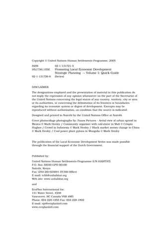 This document provides an overview of a training series on promoting local economic development through strategic planning. The series includes four volumes: a quick guide, manual, toolkit, and action guide. The quick guide summarized key information for local leaders to initiate and implement local economic development interventions through a strategic planning process involving various stakeholders. The training series was developed by UN-HABITAT and EcoPlan International to help local governments, businesses, and organizations address economic challenges and opportunities in a sustainable manner.