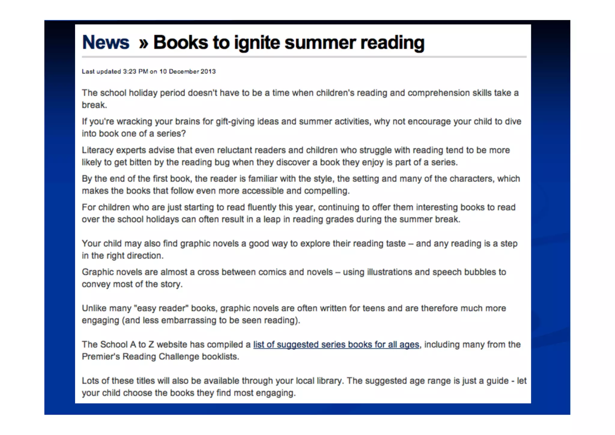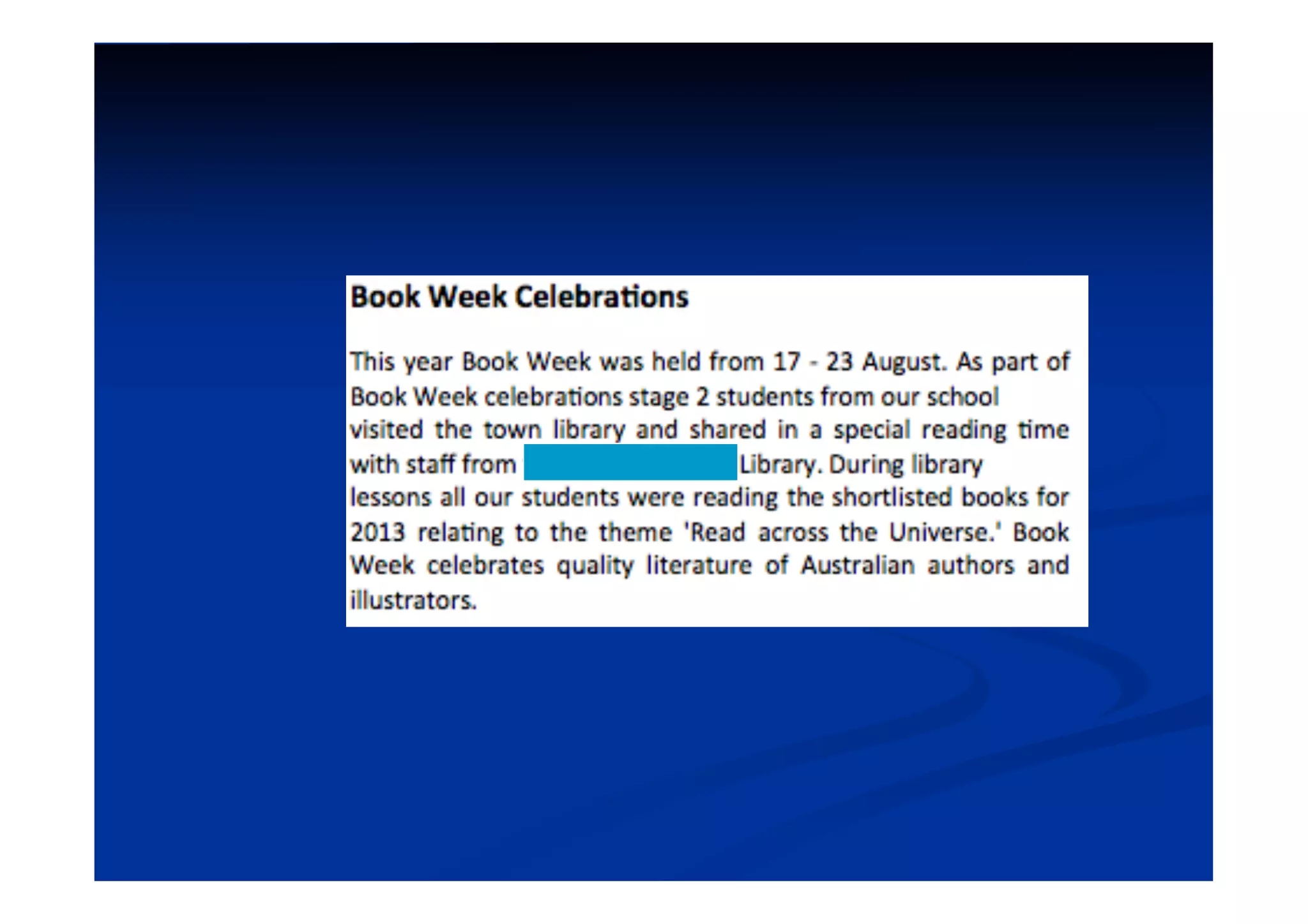 All premier's reading challenge books at the library are marked with colored dots to indicate their reading level, making them easy for children to find on the shelves. The teacher-librarian enjoys sharing shortlisted books from the Children's Book Council of Australia to model her appreciation for quality writing and illustrations. She combines enthusiasm and ingenuity to maximize learning opportunities by asking questions about stories and authors, then drawing on students' curiosity to research more using an interactive whiteboard. For example, when introducing the book The Little Refugee, she showed a comedy video by the author, read the book, and researched Vietnamese food to provide context, engaging students and encouraging enthusiasm for similar texts.