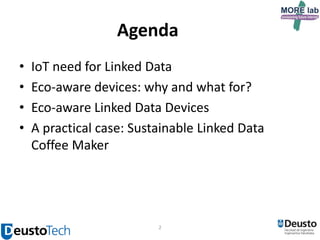 The document discusses how eco-aware linked data devices promote sustainability, focusing on the integration of Internet of Things (IoT) technologies to optimize energy use. It highlights a case study of a sustainable coffee maker that uses linked data principles to minimize energy waste by adapting to usage patterns and providing feedback to users. The presentation emphasizes the importance of cooperation between humans and devices to enhance energy efficiency and environmental awareness.
