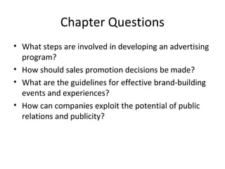 The document discusses various aspects of promotion including developing advertising campaigns, sales promotion tactics, using sponsored events for brand building, the roles and tools of public relations, the key elements of direct marketing campaigns, and managing a sales force including determining size, compensation, recruiting, and evaluating performance. It provides information on different promotion methods and considerations for each in a structured way with headings, figures, and tables.