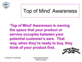 This document discusses various promotion mix tools used in integrated marketing communication, including advertising, sales promotion, public relations, and personal selling. It defines each tool and outlines their objectives such as building awareness, creating interest, providing information, and stimulating demand. Advertising is defined as a paid, non-personal form of mass communication used to promote products and services. Sales promotion includes short-term incentives to encourage purchases. Public relations involves planned efforts to build goodwill through credible communications. Personal selling is direct communication between sales representatives and prospects that can lead to transactions and relationships.