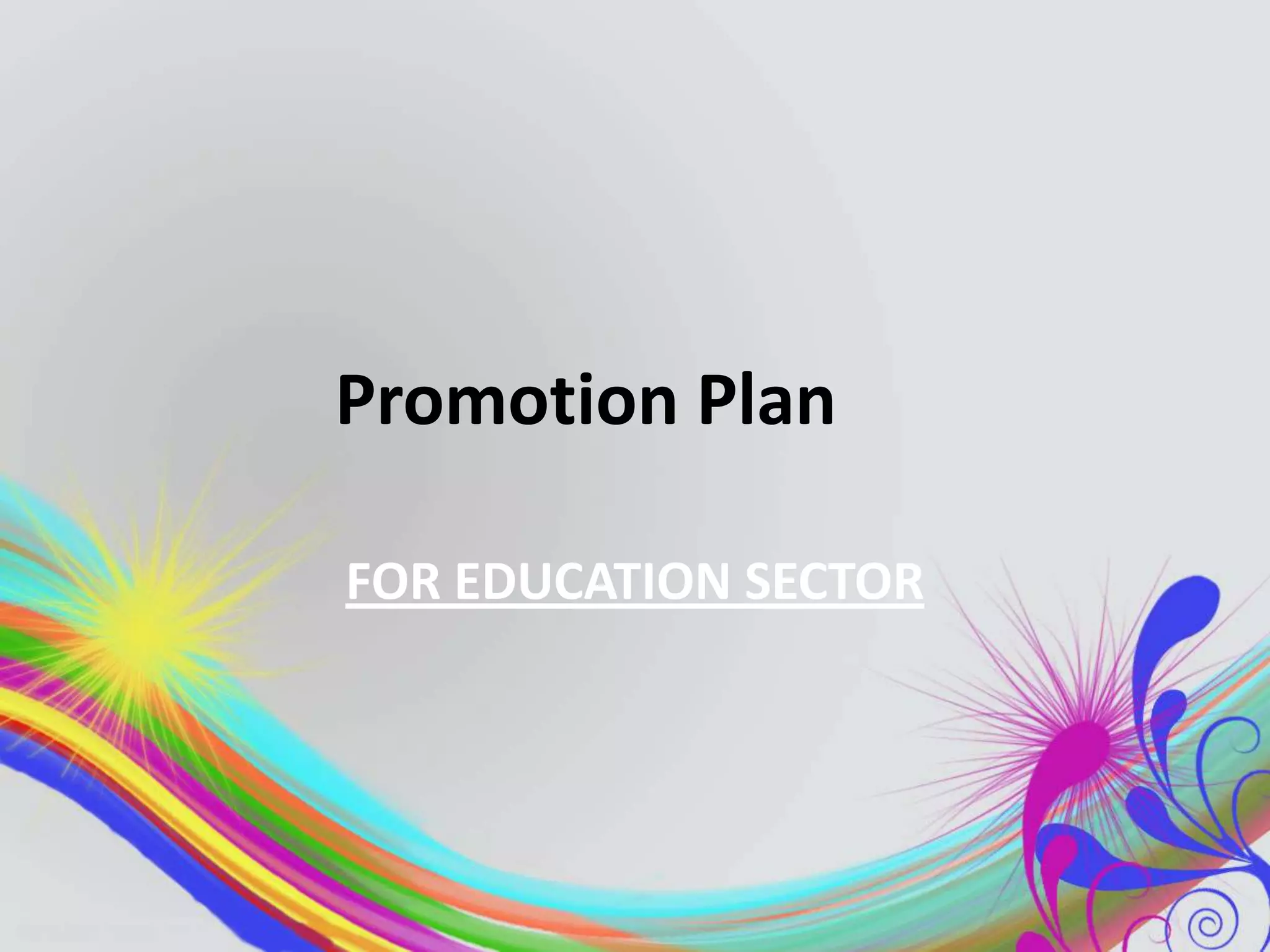 The document outlines a comprehensive promotion plan for the education sector focusing on SFR Consulting, a team dedicated to supporting start-up companies. It includes analyses such as SWOT and PEST, detailing marketing strategies and communication objectives to raise awareness and promote educational programs. Various promotional tactics are suggested, including advertising, public relations, and internet marketing, alongside recommendations for reallocating funds and improving internal communications to enhance brand image and student recruitment.