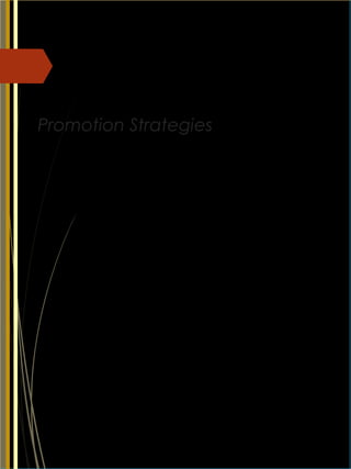 The document discusses promotion strategy, which involves initiating and maintaining communications between a company and its target markets. It outlines the key components of developing an effective promotion strategy, including determining communication objectives, deciding the role of promotion components like advertising, sales promotion, public relations, personal selling, and direct marketing, setting the promotion budget, and developing promotion component strategies. The document also addresses integrating the various promotion elements, implementing the overall strategy, and evaluating the effectiveness of the promotion strategy.