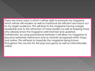 The document discusses promotional strategies for a new pop rock magazine. It will use both traditional methods like newspaper advertisements, television, and radio as well as modern social media methods. Traditional methods will help reach older audiences while social media on platforms like Facebook, Twitter, and Instagram will attract younger audiences. Partnering with celebrities on social media can help create buzz and trends to promote the magazine worldwide. An app and Facebook page will also make magazine information easily accessible.