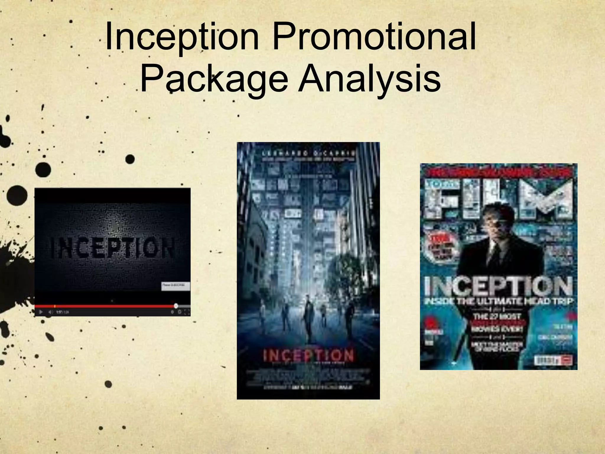 The document analyzes the promotional package for the film Inception. It discusses three key aspects: the trailer, poster, and press coverage. The trailer gives audiences a preview and allows them to form an opinion, while the poster provides intrigue to further research the film. Both the trailer and poster feature a physics-defying folded landscape scene to emphasize the mind-bending nature. Press coverage was also important, achieving critical acclaim in reviews and a unique Facebook game and YouTube video that related to the psychological thriller genre. Consistencies across the promotions, like a dark blue color scheme, bold sans-serif font, and portrayals of Leonardo DiCaprio in a sophisticated way, help craft the film's brand identity.