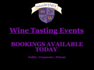 This document discusses wine tasting event bookings and provides details on corporate and private events. It also summarizes information about Italian wines, highlighting that Italy has the most indigenous grape varieties in the world and its wine quality has greatly improved over the last two decades. The document also includes a sample menu for a wine tasting event featuring Italian dishes.